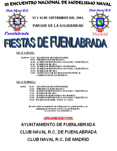Entre los días 15 y 16 de septiembre se celebro el III Encuentro Nacional de Modelismo Naval en Fuenlabrada (Madrid) con motivo de sus Fiestas Patronales y organizado por el Club Naval R/C de Fuenlabrada, el Club Naval R/C de Madrid y El Ayuntamiento de Fuenlabrada.